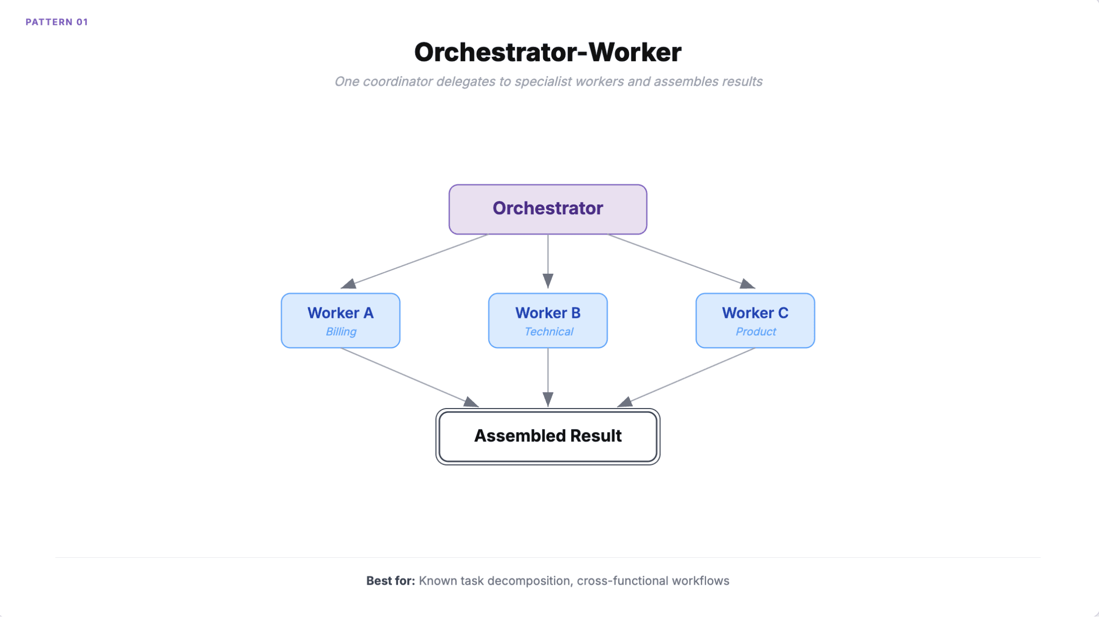 Known task decomposition? Orchestrator-worker. You know the subtasks at design time and want a single accountability point.