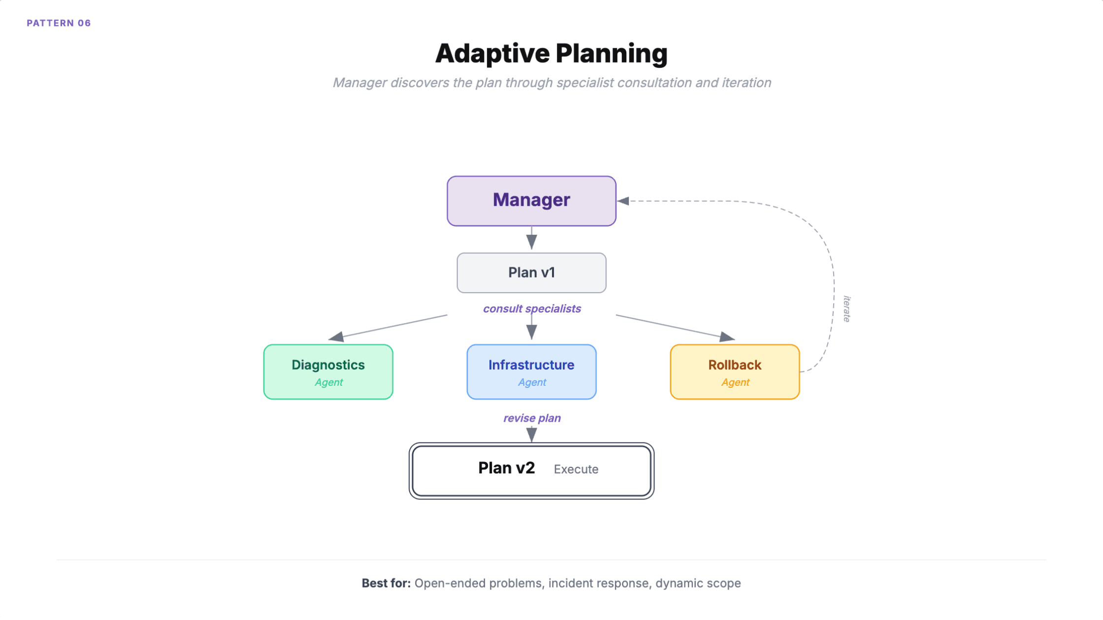 Microsoft documents an SRE example: the manager creates an initial plan, consults diagnostic and infrastructure agents, and when diagnostics reveals a database issue instead of a deployment problem, the entire plan pivots in real time.