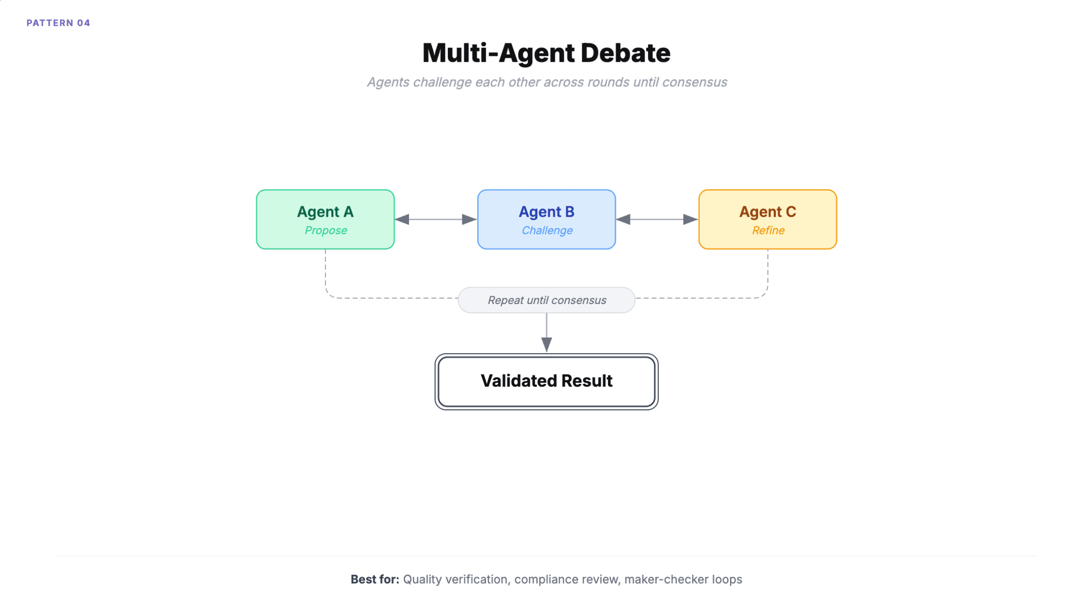 When to use it: Compliance review requiring multiple expert perspectives. Quality assurance with structured review. Research shows debate reduces hallucinations compared to single-model queries because agents catch each other's mistakes.