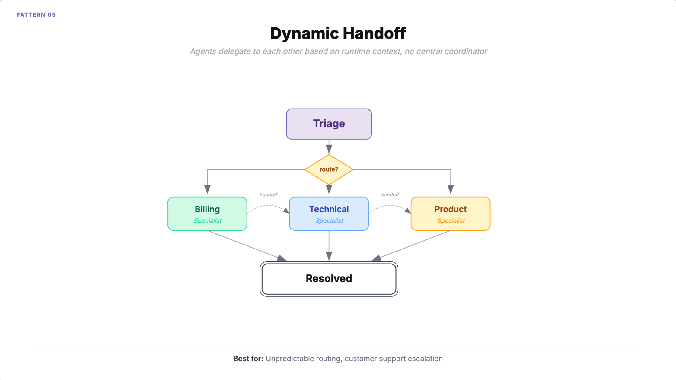 Unpredictable routing? Dynamic handoff. You cannot know which specialist is needed until the conversation unfolds.