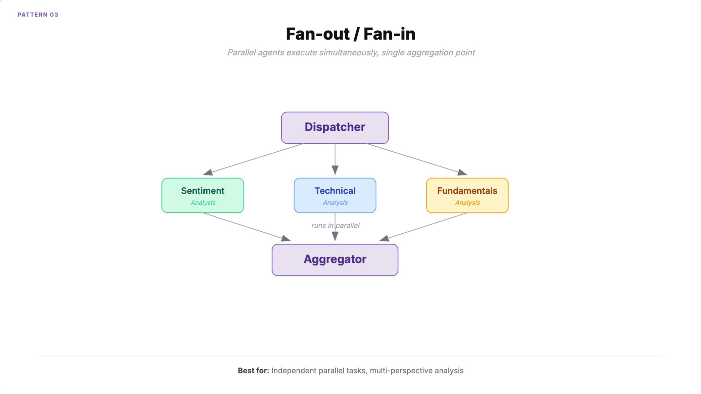 When to use it: Multi-perspective analysis (financial analysis with fundamental, technical, sentiment, and ESG agents running in parallel). Concurrent code review across security, style, and performance. Any scenario with four or more independent tasks where you need to cut wall-clock time by 75%.