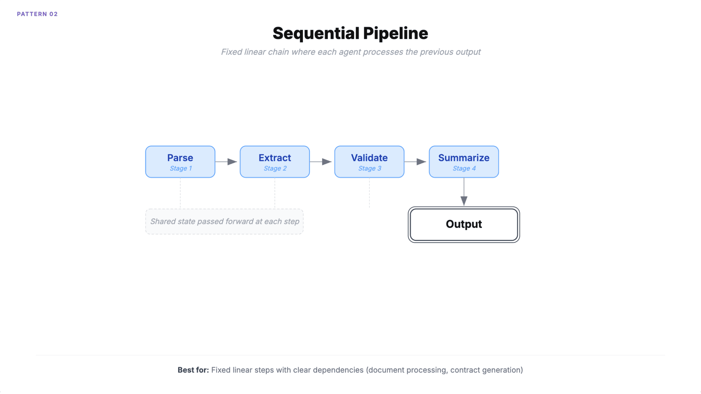 When to use it: Document processing (parse, extract, validate, summarize). Contract generation. Content moderation. Any multi-stage process with clear linear dependencies.