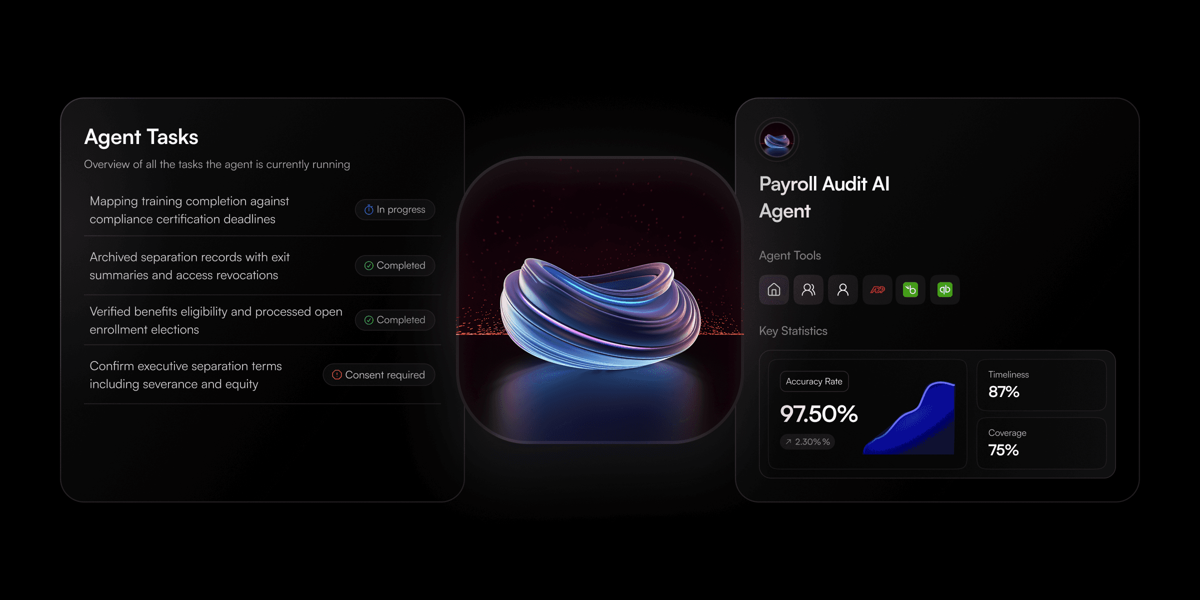 Works with Payroll Manager, Time & Attendance, and Expense Audit agents. The Audit agent is the final gatekeeper, ensuring the output of other agents is accurate before funds release.