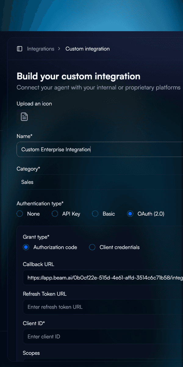 قم بتوصيل الأنظمة المخصصة وواجهات برمجة التطبيقات الداخلية عن طريق تحميل مواصفات OpenAPI 3.0. تقوم Beam باستخراج النقاط الطرفية المتاحة من مواصفات OpenAPI وتطبيعها إلى إجراءات يمكن تغليفها في مهارات. بالنسبة لمعظم العملاء المؤسسيين، تمثل التكاملات المخصصة حوالي 80% من احتياجات التكامل لديهم - واجهات برمجة التطبيقات الداخلية، الأنظمة القديمة، والأدوات الخاصة.
