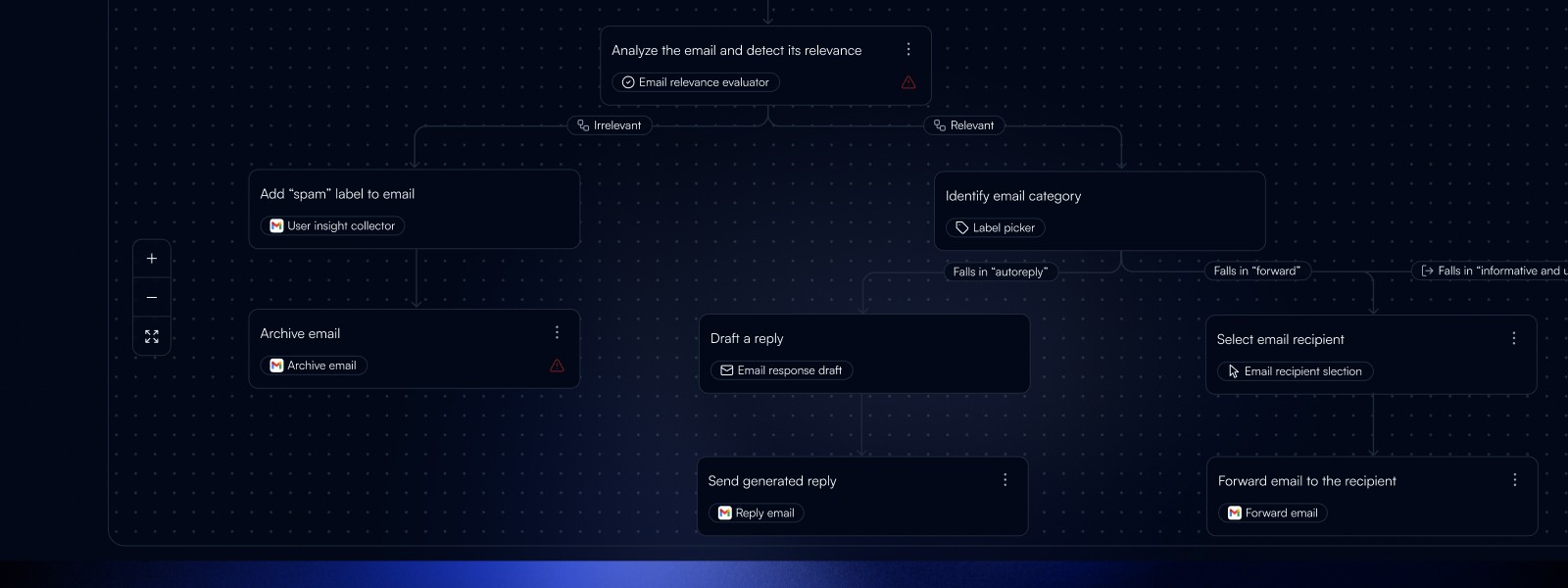 Ein Flow ist eine grafenbasierte Struktur, die die Ausführung von Agenten definiert. Knoten führen Aktionen aus: KI-Verarbeitung, API-Aufrufe, Datenoperationen. Zweige erstellen bedingte Pfade. Zusammenführungspunkte vereinigen mehrere Zweige. Das Ergebnis ist, dass Sie die Zuverlässigkeit von festen Workflows für vorhersehbare Schritte erhalten und die Flexibilität der KI-Überlegungen für komplexe Entscheidungen. Im selben Agenten, im selben Workflow.