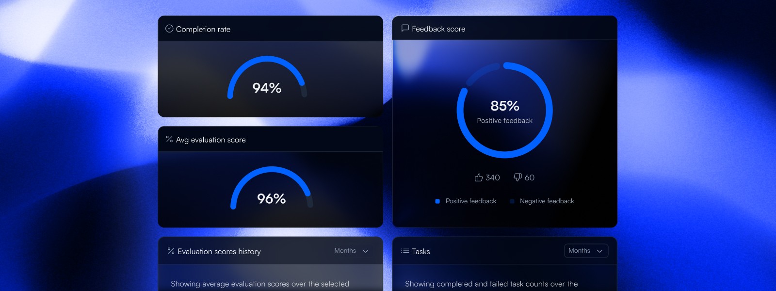 Konfigurieren Sie Bewertungskriterien pro Knoten. Das System validiert automatisch das Format, die erforderlichen Felder und die Datenkorrektheit. Jede Ausführung erhält eine Genauigkeitsbewertung. Verfolgen Sie die Abschlussrate (Ziel: 95%+), die Bewertungsnote und die Feedbackbewertung. Bei sinkenden Werten werden automatische Wiederholungen ausgelöst, mit selbstheilenden Hinweisen. Sie wissen immer genau, wie Ihre Agenten arbeiten. Und Sie können es beweisen.
