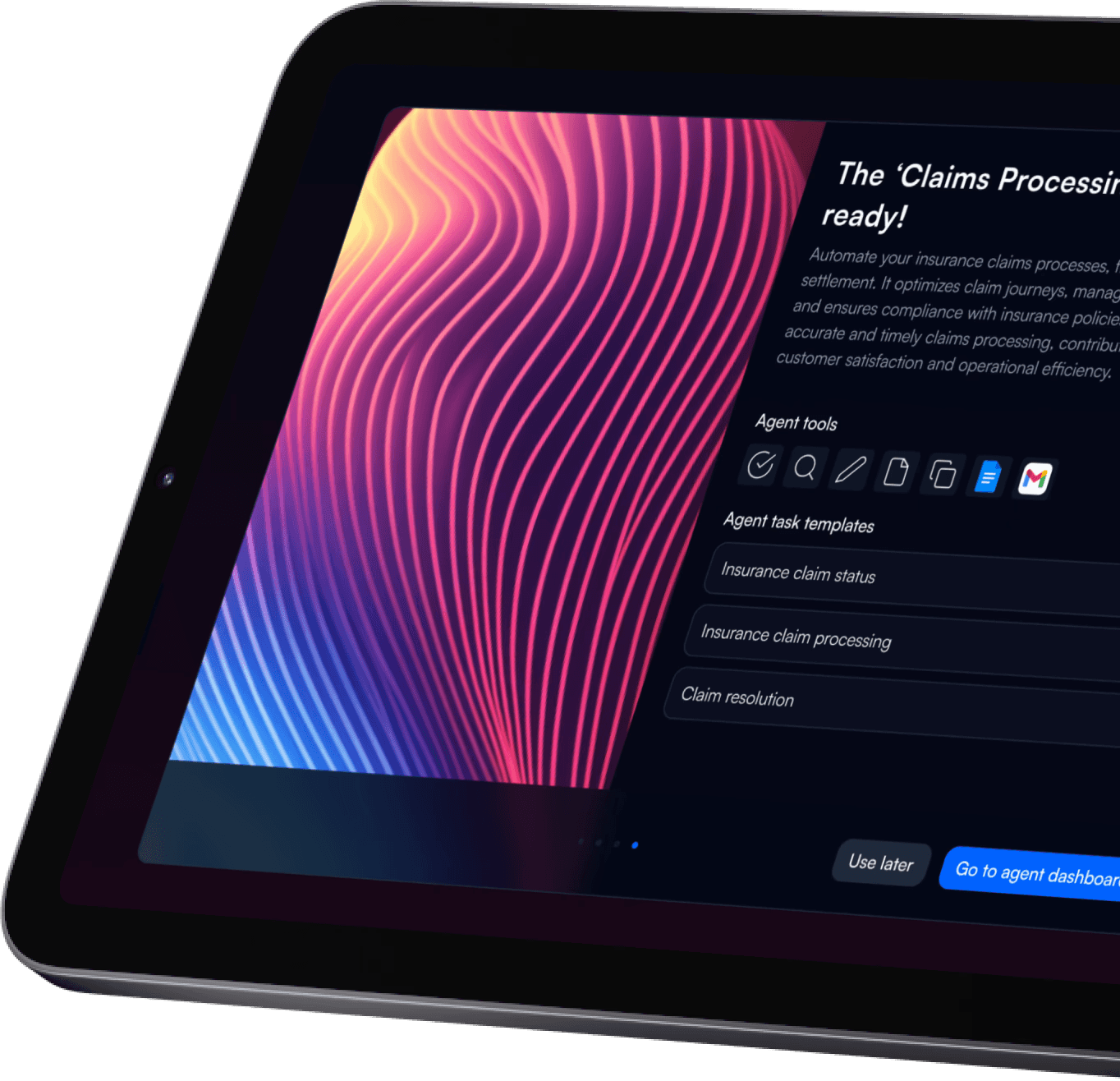 Acceda a un conjunto completo de agentes de IA formados con sus datos y procedimientos operativos estándar desde un único lugar. Implemente un agente de tramitación de siniestros para atender cientos de solicitudes en cuestión de minutos, o recurra a agentes de IA de suscripción, KYC o personalización de pólizas para automatizar por completo sus procesos de seguros.