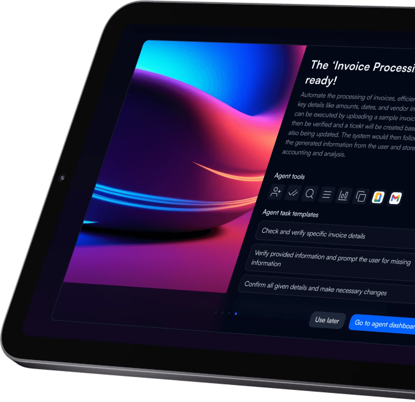 Su agente de procesamiento de facturas puede formarse utilizando la documentación y los procedimientos normalizados de trabajo en los que confía su empresa. Si a esto le añadimos su capacidad para comprender a fondo los documentos, obtendremos un potente y eficaz procesador de facturas con inteligencia artificial. Acceda a su agente de procesamiento de facturas, junto con todos los demás agentes de IA de su equipo, desde un panel de control integral