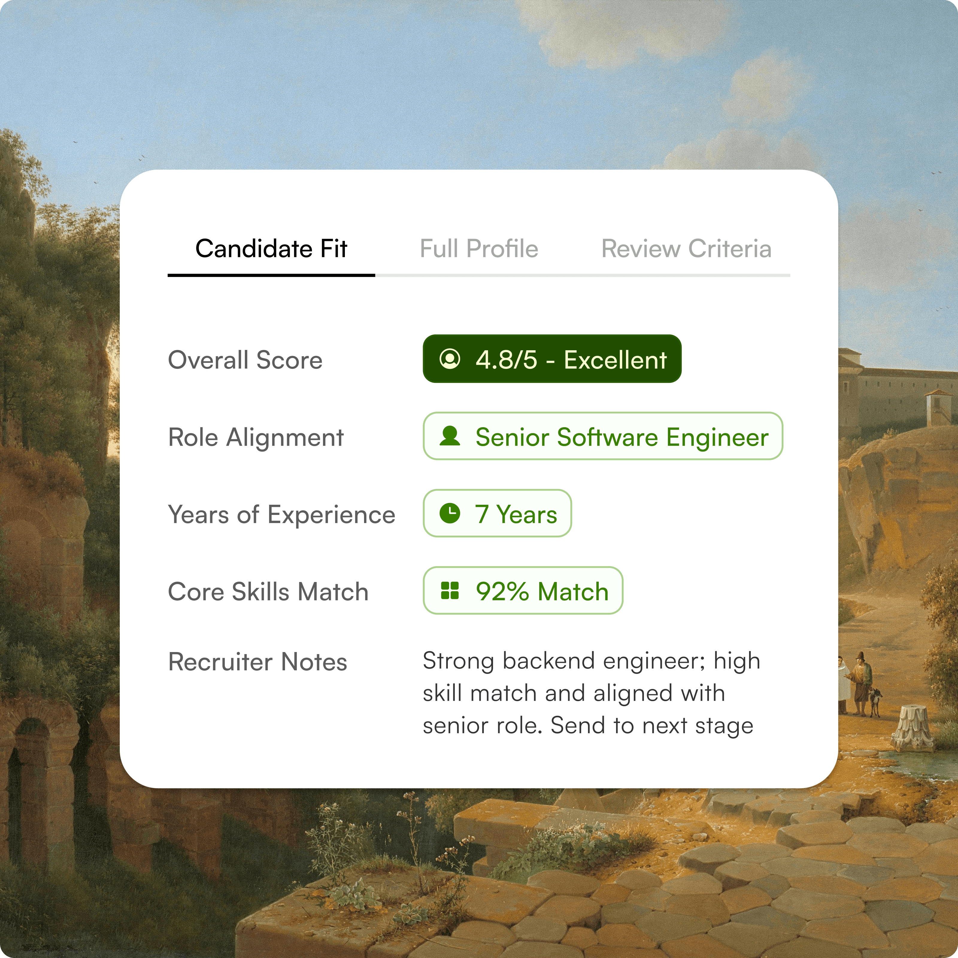 Evaluate every candidate against your hiring criteria in minutes. AI agents analyze resumes, experience, and skill signals to surface the strongest matches instantly, so recruiters spend their time interviewing qualified candidates instead of reviewing resumes.
