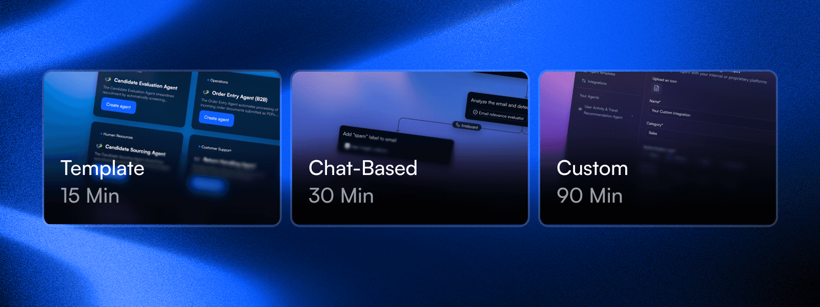 Templates (5-15 minutes): Pre-configured agents for common use cases. Customer service, email triage, data extraction, invoice processing. Clone, customize trigger and integrations, deploy. Fastest path to production. Chat-based (15-30 minutes): Describe what you want. AI generates workflow structure and suggests tools. Best for clear requirements when you want quick setup. Custom (30-90 minutes): Empty canvas, full control. Build node by node for unique workflows and precise requirements. Best for advanced users with specific needs.