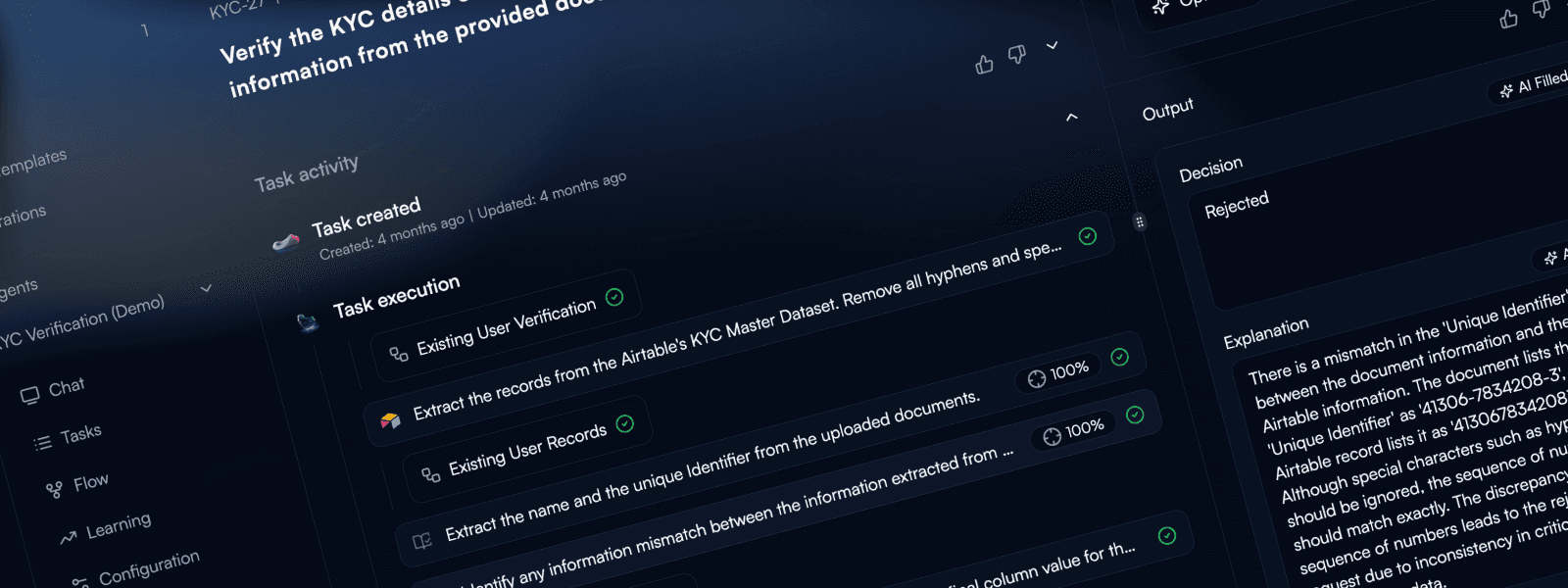 When agents fail, see exactly where. Click any task to see the complete execution trace. Every node's status, duration, and output. Click a failed node to view error message, input data, and what it tried to do. Common errors diagnosed: data format issues, missing fields, auth failures, timeouts. Fix the problem, rerun from that step, not from the beginning. What used to take hours of log diving now takes seconds.
