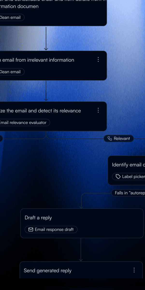 Visual agent builder for business users and developers. Start from templates and deploy in minutes. Build custom workflows with drag-and-drop. Test with real data before going live. Debug failures in seconds. Optimize accuracy with AI. One interface for the full lifecycle. Build, test, deploy, monitor, improve. Ship agents that actually work in production, not prototypes that demo well.