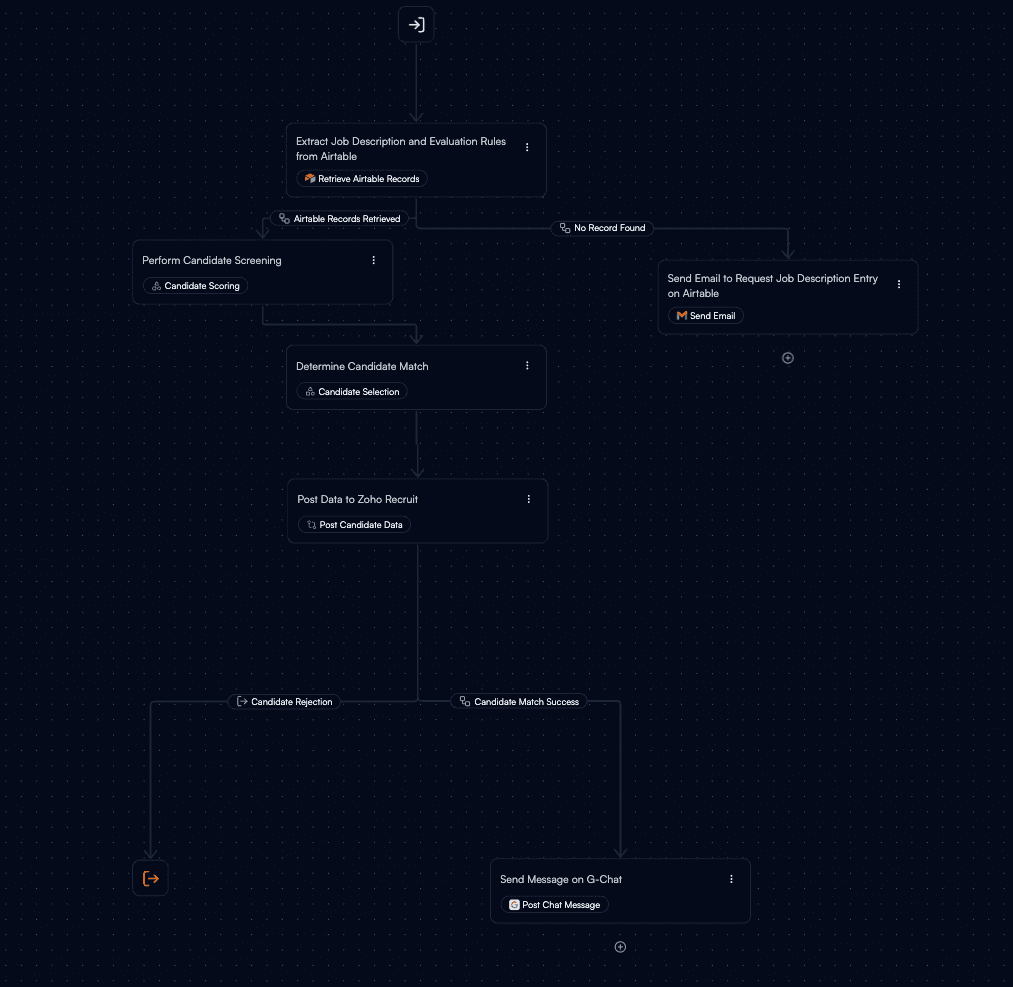 To streamline and scale the screening process, CV Screening Agent was deployed. The workflow integrates: